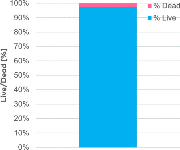 為了評(píng)估spheroONE®分離后類球體的活性,在分離后4小時(shí)進(jìn)行了活/死染色(圖5)。分離和分裝并未損害細(xì)胞聚集體的完整性及其活性(圖5)。總體而言,細(xì)胞存活率超過 97%(圖5b)