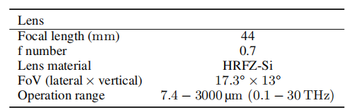 實驗使用了瑞士太赫茲相機和太赫茲鏡頭(連接:https://www.auniontech.com/details-2108.html)。其規(guī)格分別見表1和表2。