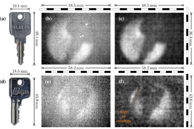 圖5:金屬鍵的成像圖拍攝粗糙尺寸(a、d),按鍵的原始THz圖像(b、e),去除死像素后的處理THz圖像(c、f)。鑰匙仍然可以在標準紙信封(e、f)內(nèi)解析,并標記信封的邊緣(f)。