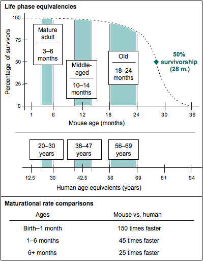 不同種系的小鼠壽命有所不同,在衰老相關(guān)研究中,應(yīng)用比較廣泛的是C57BL/6小鼠。根據(jù)Jackson實(shí)驗(yàn)室的相關(guān)研究,小鼠相對(duì)于人的年齡可以分為三個(gè)階段(圖3)。一般認(rèn)為,年齡超過(guò)18月的小鼠即為老齡小鼠。