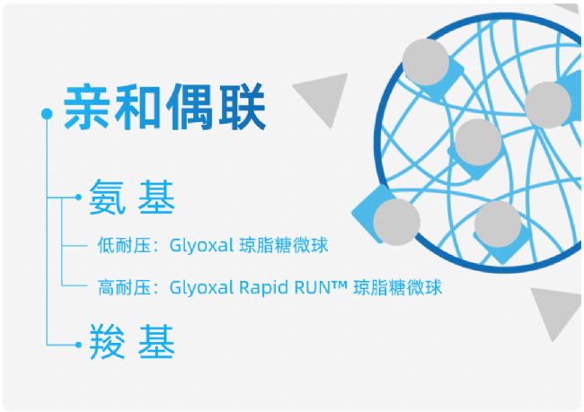 Glyoxal 微球是預(yù)活化的凝膠,允許瓊脂糖與目標(biāo)配基的賴氨酸氨基共價結(jié)合(類似于 CNBr 朝向),ABT 擁有廣泛的產(chǎn)品線,具有不同程度的醛基,并使用兩種不同的主鏈,4% 和 6% 瓊脂糖含量的微球和不同的粒徑。這些凝膠為低耐壓應(yīng)用和高耐壓應(yīng)用的大規(guī)模 Rapid Run™ 提供了足夠多的選擇,可適用于批次生產(chǎn)或裝柱純化。