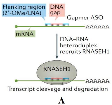 反義寡核苷酸(antisense oligonucleotides,ASO)指與靶基因mRNA互補的一段單鏈DNA或RNA序列,長度通常為15-25nt,通過堿基配對原則與其互補的RNA結(jié)合,可以調(diào)節(jié)靶RNA的功能。ASO的作用機制主要分為兩大類:一類是基于RNase H1-介導(dǎo)的mRNA降解機制(圖1A所示);另一大類是基于ASO結(jié)合帶來的空間位阻,封閉mRNA關(guān)鍵區(qū)域,從而影響mRNA的成熟或者翻譯為蛋白質(zhì)(圖1B所示)。