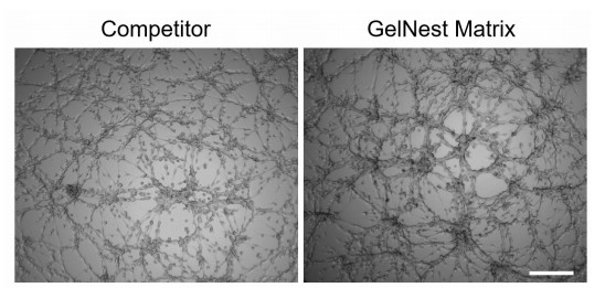 圖 1.HUVEC 細(xì)胞分別在競(jìng)品和本公司(GelNest Matrix)基質(zhì)膠上培養(yǎng) 9 個(gè)小時(shí)后形成血管網(wǎng)絡(luò)的結(jié)果。標(biāo)尺為 300µm。