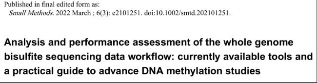 1、Gong T, Borgard H, Zhang Z, Chen S, Gao Z, Deng Y. Analysis and Performance Assessment of the Whole Genome Bisulfite Sequencing Data Workflow: Currently Available Tools and a Practical Guide to Advance DNA Methylation Studies. Small Methods. 2022 Mar;6(3):e2101251. doi: 10.1002/smtd.202101251. PubMed PMID: 35064762.