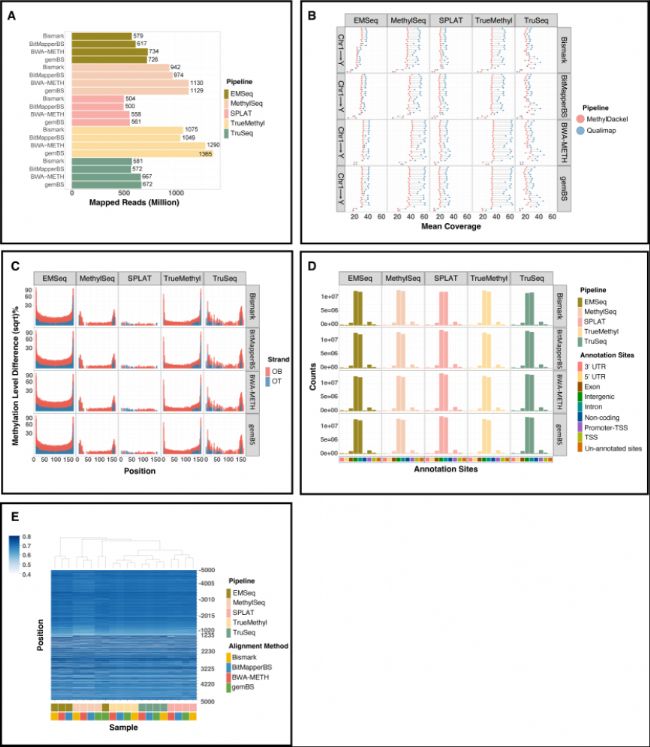 DNA甲基化和其他表觀基因組分析的動(dòng)態(tài)標(biāo)記與不同人類疾病的診斷和預(yù)后相關(guān)聯(lián)。對甲基化結(jié)果的深刻且低偏倚解釋是下游生物學(xué)機(jī)制研究的核心。本綜述討論了分析WGBS數(shù)據(jù)的計(jì)算方法,并介紹了使用現(xiàn)有工具從原始reads檢測DMR所需的基本QC分析步驟。此外,還提出了甲基化文庫制備和數(shù)據(jù)處理中固有的潛在混雜因素及其對策。希望潛在用戶能夠理解WGBS的基本概念,從而加速人類疾病的發(fā)現(xiàn)。