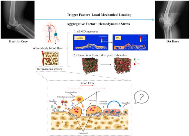 骨關(guān)節(jié)炎(OA)不再被視為關(guān)節(jié)軟骨磨損的簡單問題。相反,骨關(guān)節(jié)炎是一種涉及軟骨和非軟骨組織(如軟骨下骨和滑膜)的全關(guān)節(jié)疾病。其中,軟骨下骨隨著力學(xué)環(huán)境的變化而不斷重塑。目前對OA軟骨下骨紊亂的理解jinxian于其與韌帶或半月板損傷導(dǎo)致的局部機(jī)械負(fù)荷改變的聯(lián)系。最近,高血壓,最常見的血管疾病,已成為OA的一個(gè)獨(dú)立危險(xiǎn)因素。這可能表明全身血流動(dòng)力學(xué)機(jī)械應(yīng)力在軟骨下骨重塑和OA發(fā)病機(jī)制中具有合理的作用。然而,他們的關(guān)系仍未完全了解。
