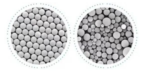 ProPac 3R進一步完善應(yīng)用方法,提供更優(yōu)的分離度結(jié)果,并采用單分散填料(圖1)解決批次重現(xiàn)性問題。它采用生物惰性材料設(shè)計,可以為蛋白質(zhì)和AAV等分析提供可重復(fù)、高分辨率和耐用的強陽/陰離子交換色譜分離,尤其在具有挑戰(zhàn)性的多抗、融合蛋白、ADC及復(fù)方共制劑等新興治療藥物電荷異質(zhì)體分析中提供更高分辨率和重現(xiàn)性。“3R”取至穩(wěn)健性(Robustness)、重現(xiàn)性(Reproducibility)、分辨率(Resolution)英文的首字母,突出體現(xiàn)了3R的性能優(yōu)勢,孔徑也從傳統(tǒng)的10μm升級至小粒徑的3μm。