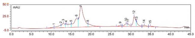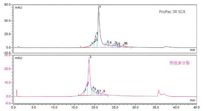 圖2 ProPac 3R SCX色譜柱與多分散強陽離子交換在雙抗的分離譜圖