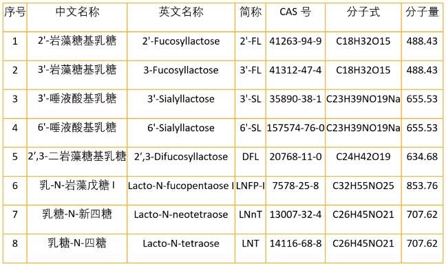 目前,國家衛(wèi)健委官網(wǎng)陸續(xù)發(fā)布或公開征求意見的HMOs允許用于食品添加已有5種,分別為:2'-巖藻糖基乳糖(2'-FL)、3-巖藻糖基乳糖(3'-FL)、乳糖-N-新四糖(LNnT)、6'-唾液乳糖鈉鹽(6'-SL)和3'-唾液酸乳糖鈉鹽(3'-SL),讓HMOs成為奶中 “新貴”,是嬰配行業(yè)普遍關(guān)注的重要功能性配料之一。