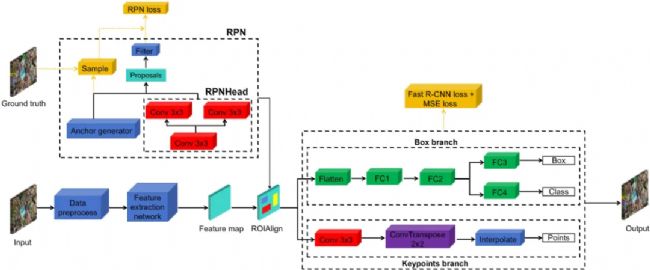 圖2基于Mask R-CNN網(wǎng)絡(luò)的Point-Line Net模型:在目標(biāo)檢測(cè)分支中,模型負(fù)責(zé)推理目標(biāo)的位置及其類別;在關(guān)鍵點(diǎn)檢測(cè)分支中,結(jié)合目標(biāo)檢測(cè)結(jié)果對(duì)關(guān)鍵點(diǎn)的熱圖進(jìn)行模型推理。