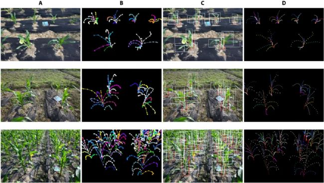 圖3 Point-Line Net在各種場(chǎng)景下的預(yù)測(cè)結(jié)果:(A)原始RGB圖像;(B) Labelme工具轉(zhuǎn)換的地面真實(shí)值;(C)預(yù)測(cè)邊界框(紅色框代表識(shí)別出的的根莖類別,白色框代表識(shí)別出的的葉片類別);(D)預(yù)測(cè)關(guān)鍵點(diǎn)。