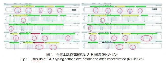 48份現(xiàn)場(chǎng)物證 DNA 模板經(jīng)真空離心濃縮儀濃縮4.4倍至7.7倍后,獲得的圖譜分型峰高明顯提高。 峰值均衡性改善,判別出部分非特異性帶和假純合子,等位基因數(shù)由1334個(gè)增加到1942個(gè),有效分 型樣本由19份增加到27份。部分樣本圖譜質(zhì)量顯著改善(見(jiàn)圖 1)。