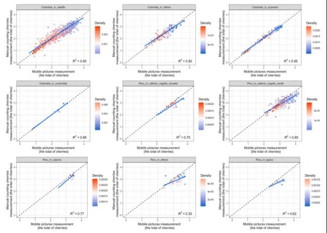 圖 7. 預(yù)測與實測的每棵樹咖啡櫻桃數(shù)量比較。該圖為散點圖,比較了按國家和品種分類的每棵樹預(yù)測和實際的咖啡櫻桃數(shù)量。坐標軸采用 log10(X+1) 轉(zhuǎn)換。