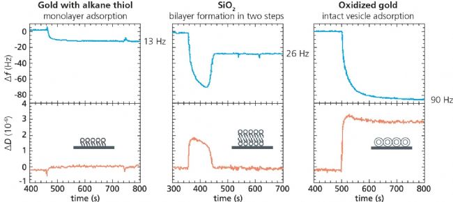 1998 年,Keller 和Kasemo發(fā)表了一篇開創(chuàng)性的論文1 ,展示了 QCM-D 在分析界面脂質(zhì)行為方面的強大功能。該論文探討了脂質(zhì)-表面相互作用動力學(xué),即脂質(zhì)如何與三種不同類型的表面材料相互作用和排列,直接且實時地揭示了脂質(zhì)在表面形成的是單層、雙層還是一層完整的囊泡,這是當(dāng)時任何其他檢測方法都無法實現(xiàn)的。