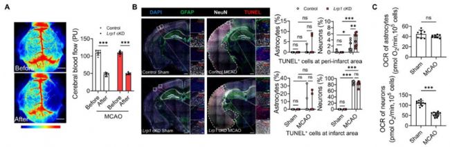 接下來,團(tuán)隊通過建立腦缺血動物模型(大腦中動脈閉塞MCAO,線栓法),驗證LRP1誘導(dǎo)的線粒體轉(zhuǎn)移是否能保護(hù)腦缺血損傷。團(tuán)隊借助7.0T 磁共振、行為學(xué)評估和共聚焦顯微鏡證實了LRP1-ARF1 Kla73軸在調(diào)控星形膠質(zhì)細(xì)胞線粒體轉(zhuǎn)運中的重要作用。最后,團(tuán)隊通過腦卒中患者臨床樣本進(jìn)一步驗證了其研究發(fā)現(xiàn)。