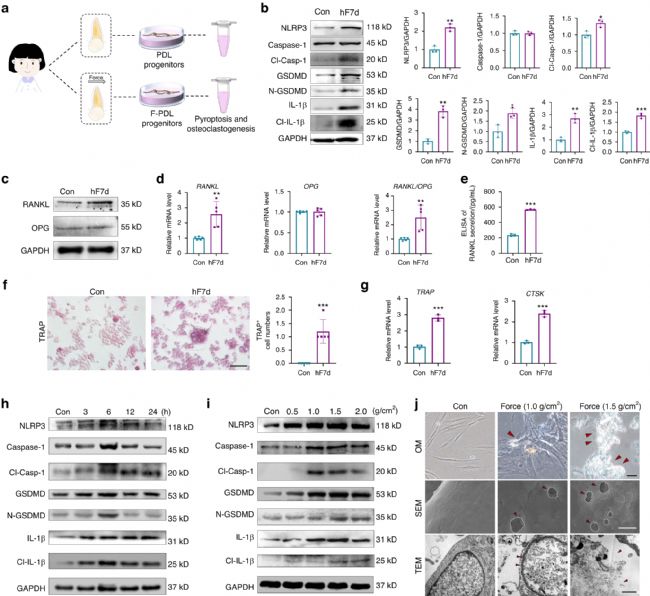 圖2 機械力誘導(dǎo)人PDL祖細胞焦亡并影響破骨細胞活性。
