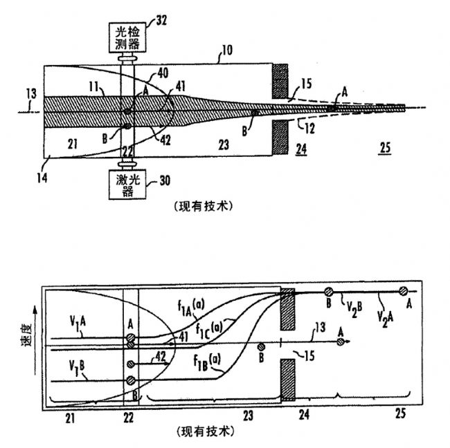 在流動(dòng)室內(nèi),鞘液形成的流體動(dòng)力學(xué)聚焦過程中,細(xì)胞距離中心軸的位置不同,其流體速度也不同?拷室毫鞯募(xì)胞加速較慢,而位于中心軸的細(xì)胞加速較快。通過噴嘴后,由于動(dòng)量守恒,速度方程又會變化。