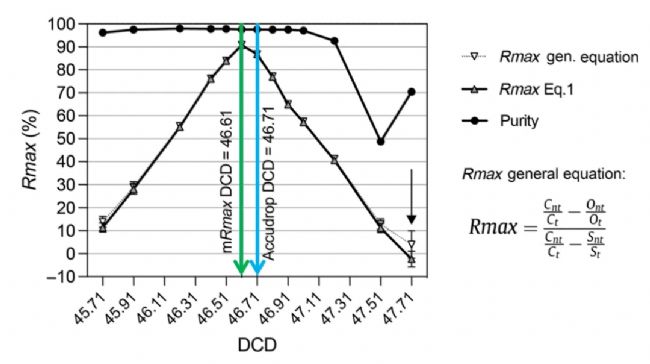 因此,有些儀器雖然能夠通過微球自動(dòng)估算出DCD的值,但卻與Rmax的最優(yōu)解存在較大誤差。例如,Rmax方法獲得的最優(yōu)DCD,得率可以達(dá)到90%,但自動(dòng)計(jì)算獲得的DCD雖然對純度沒有影響,卻導(dǎo)致得率下降。