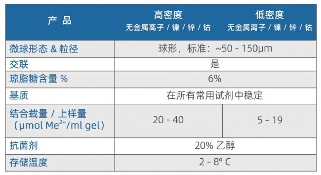 - 填料螯合有鎳、銅、鋅或鈷離子,也有無金屬離子的