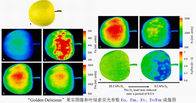 2022年Schlie等人為了進一步了解蘋果在貯藏過程中的熒光異質(zhì)性,以及開發(fā)一種識別LOL的方法,利用FluorCam熒光成像系統(tǒng)對在足夠的氧水平和低氧脅迫條件下處理的“Braeburn”和“Golden Delicious”兩種蘋果進行了測量。