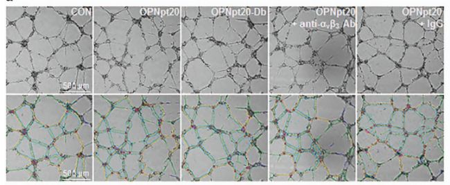 在本研究中,實驗人員研究了 OPNpt20 在人臍靜脈內(nèi)皮細胞(HUVECs)和大鼠局灶性腦缺血模型中的促進血管生成的潛能。此外,研究者還利用三種突變肽(RGD → RAA、SLAY → SLAA 和 RGDSLAY → RAASLAA)和αvβ3-整合素阻斷抗體探討了 OPNpt20 促血管生成作用背后的分子機制。結(jié)果證明,OPNpt20在體內(nèi)外均有促血管生成作用。雖然OPN的促血管生成作用已經(jīng)在各種病理生理條件下被證實,但此次結(jié)果證實了外源性O(shè)PN二聚體肽OPNpt20與內(nèi)源性αvβ3整合素結(jié)合,通過突變肽和阻斷抗體在體外和缺血后腦中誘導促血管生成作用。