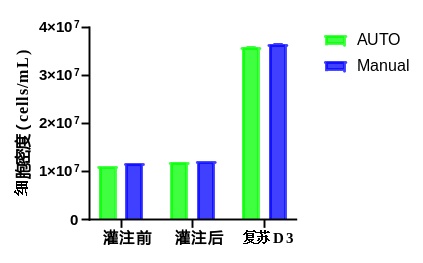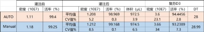從結(jié)果可以看出灌注前后:AUTO(設(shè)備灌裝)和Manual(手動(dòng)灌裝)組內(nèi)無差異,組間相比AUTO組細(xì)胞密度、灌裝體積的CV值比Manual組低;兩組細(xì)胞活率CV值差異較小。在復(fù)蘇D3:AUTO和Manual組間相比,AUTO組密度的CV值比Manual組低10.9%;活率CV值比Manual組低4.5%;從DT上看AUTO組和Manual組無明顯差異,證實(shí)灌裝過程對(duì)細(xì)胞無損傷,不會(huì)改變細(xì)胞增殖規(guī)律,灌裝過程均無染菌、總體上結(jié)果表現(xiàn)良好。本次測(cè)試表明灌注前后、凍存復(fù)蘇后AUTO表現(xiàn)均優(yōu)于手動(dòng)組。