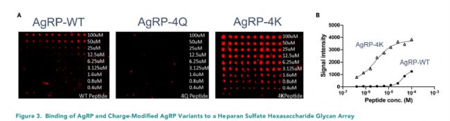 結(jié)果顯示:AgRP和電荷修飾AgRP變體與硫酸肝素聚糖陣列相結(jié)合;AgRP的結(jié)合親和力與巰基化狀態(tài)和硫酸肝素寡糖的長度有關(guān),6S和NS磺化對AgRP的結(jié)合有利,而3S磺化對AgRP的結(jié)合不利,AgRP-4K突變型的結(jié)合能力是野生型的50倍,如下圖。