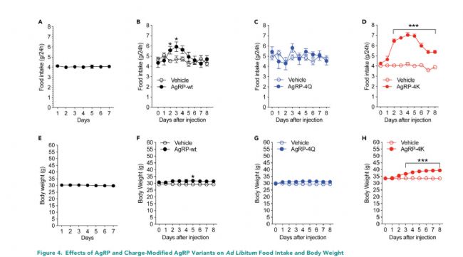 結(jié)果顯示:AgRP-4K突變型小鼠對食物的攝取量和體重都有明顯增加,如下圖(A、E每日基本進(jìn)食量;B、F未突變野生型;C、G、D、H突變型)。