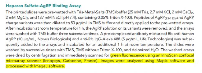 第二步:氨基(-NH2)修飾的的硫酸肝素聚糖化合物點(diǎn)印在NHS包被的玻片上,AgRP(WT)和兩種AgRP電荷變體肽(4Q;4K)在TMS緩沖液中稀釋至50 mg/mL,與玻片進(jìn)行孵育,隨后加入絡(luò)合的Rb抗人AgRP 抗體(10 mg/mL,一抗)和抗Rb IgG-Alexa 488 (5 mg/mL,熒光二抗),最后使用