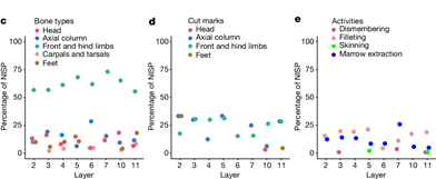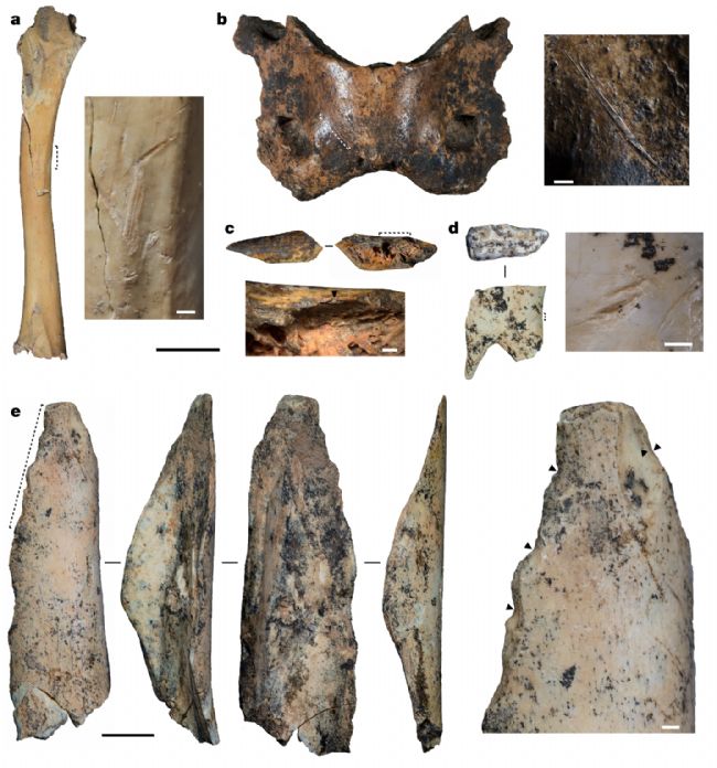 在食肉動物、小型哺乳動物和鳥類的骨骼中也發(fā)現(xiàn)了人類改造的痕跡(圖5)。102個食肉動物標本中,8個黑豹屬、豹亞科和犬科(不包含狐貍)的標本發(fā)現(xiàn)了切痕和敲擊缺口。小型哺乳動物中,1個旱獺屬(第 9 層;圖5c )的橈骨骨干標本上觀察到了敲擊缺口,表明提取了骨髓。此外,7 個兔屬(第 3、4 和 11 層)和 4 個旱獺屬(第 9 至 11 層)的前肢和后肢骨干碎片顯示出新鮮的骨斷裂痕跡,這些通常是人類活動產(chǎn)生的。最后,在鳥類遺。╪ = 45)中,鷹類標本上有切割痕跡(n = 1;圖5a)和新鮮骨裂痕跡(n = 3),但其他鳥類標本(包括雉類、鵪鶉或貓頭鷹標本)上沒有發(fā)現(xiàn)?傮w而言,動物考古學(xué)數(shù)據(jù)表明,白石崖溶洞人類使用過大型食草動物、小型食肉動物、小型哺乳動物和鳥類進行多種活動。