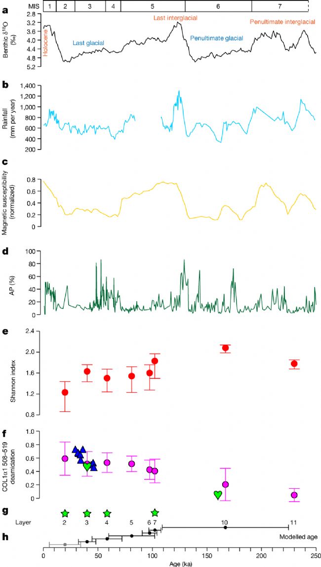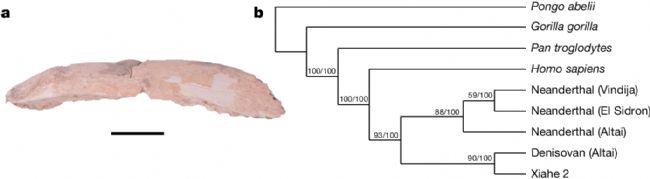 Shotgun蛋白質(zhì)組學(xué)分析為夏河2號的分類歸屬提供了更具體的信息。作者在用于系統(tǒng)發(fā)育分析的21個蛋白質(zhì)序列中重建了夏河2號標本的4,597個氨基酸位置(占總連接蛋白質(zhì)序列比對的14.5%)。這個蛋白質(zhì)組比用于夏河1號下頜骨系統(tǒng)發(fā)育分析的6個內(nèi)源蛋白質(zhì)大得多。從系統(tǒng)發(fā)育樹中也可以看出,夏河2號與已發(fā)表的高覆蓋率丹尼索瓦人基因組高度同源(圖6b)。因此,可以確定在可用的參考個體中,夏河2號與D3丹尼索瓦人的關(guān)系最為密切。夏河2號化石證據(jù)的發(fā)現(xiàn)將丹尼索瓦人在白石崖溶洞中的存在從中更新世晚期延伸到了晚更新世。