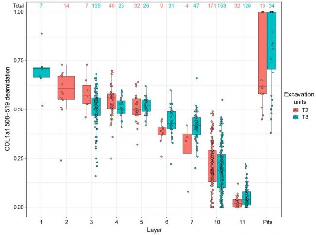 隨著白石崖溶洞各地層從頂部至底部逐漸增強,但層間重疊較大。第 3、4 和 5 層的平均脫酰胺水平接近,第 6 和 7 層接近。第 10 層,尤其是第 11 層的谷氨酰胺脫酰胺作用更加明顯(圖7)。脫酰胺作用的程度在地層內(nèi)逐漸增加,這與地質(zhì)年代學(xué)年齡估計以及地層證據(jù)一致。相比之下,來自歷史洞坑的樣本的脫酰胺值差異很大,因為這些是更新世和全新世的標本的混合。這些觀察結(jié)果與其他更新世洞穴遺址的結(jié)果一致,在這些洞穴遺址中,當?shù)貙涌缭綍r間相當長或溫度差異較大時,谷氨酰胺脫酰胺作用通常在更古老或溫度更高的年代的骨骼標本中更為明顯。