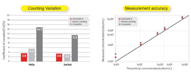 FACSCOPE® B先進的識別算法可以精確識別不規(guī)則和成團細胞,以及活細胞、死細胞和存活率,因為它的計數(shù)變化比血細胞計數(shù)器和其他計數(shù)器小,而且測量的濃度與理論濃度更接近,所以能提供更快速、更準確、更可靠的數(shù)據(jù)支持。這更有助于為新藥研發(fā)中的藥效評估、毒性測試及生物安全性研究提供堅實基礎。