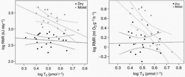 為了應(yīng)對食物供應(yīng)和環(huán)境溫度的變化,許多動物的生理機能表現(xiàn)出季節(jié)性適應(yīng)。實驗室研究表明,甲狀腺激素參與新陳代謝的調(diào)節(jié),當(dāng)個體的能量平衡受到損害時,它們的調(diào)節(jié)功能尤為重要。文中作者在南非Goegap自然保護區(qū)研究了3只生活在半干旱環(huán)境中的非洲條紋小鼠(Rhabdomys pumilio)的三碘甲狀腺原氨酸(T3)水平、靜息代謝率(RMR)和兩種能量平衡生理標(biāo)志物(血糖和酮體)的季節(jié)性變化。