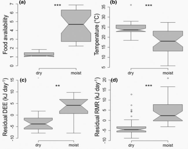 條紋小鼠在食物稀缺的旱季使用多種機制降低了它們的DEE,特別是RMR的降低,并減少了整體體力活動。這項研究表明,在試圖理解動物如何應(yīng)對惡劣環(huán)境時,考慮幾個環(huán)境因素以及它們是否同時增加或減少強度(這里以食物供應(yīng)和環(huán)境溫度Ta為例)可能很重要。因此,由于氣候變化而暴露在更惡劣環(huán)境中的動物可能能夠采用不同的應(yīng)對機制,這些機制必須同時進行研究,并且在何種程度上對變化的適應(yīng)能力會崩潰將是物種特有的。
