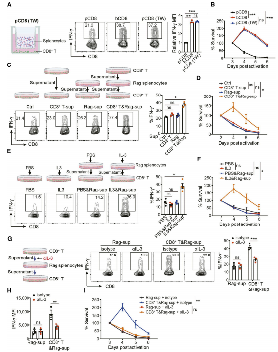 作者團(tuán)隊在研究期間發(fā)現(xiàn),IL3介導(dǎo)的CTLs 抗腫瘤活性增強(qiáng)可能涉及中間細(xì)胞群的參與。與純化的 CD8(+) T 細(xì)胞(pCD8)相比,與脾細(xì)胞共培養(yǎng)的CD8(+) T 細(xì)胞(bCD8)表現(xiàn)出以糖酵解為主的代謝模式、 IFNγ 產(chǎn)生和存活能力增強(qiáng),并且過繼轉(zhuǎn)輸?shù)胶闪鲂∈笾泻螅琤CD8 OT1細(xì)胞的抗腫瘤免疫活性更強(qiáng)。通過 transwell 系統(tǒng)研究發(fā)現(xiàn),其他細(xì)胞群釋放的可溶性因子介導(dǎo)了 CD8(+) T 細(xì)胞效應(yīng)功能的增強(qiáng)。T 細(xì)胞產(chǎn)生的可溶性效應(yīng)因子作用于某些非 T/B 細(xì)胞亞群,繼而改善 CTLs的效應(yīng)功能。IL3 在其中起到了介導(dǎo) T 細(xì)胞和非 B/T 細(xì)胞互作的關(guān)鍵作用。(圖4)