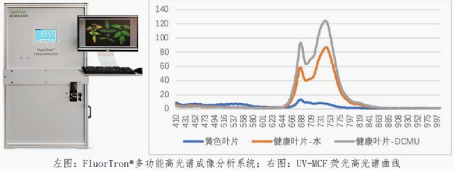 實(shí)驗(yàn)結(jié)果表明:施加DCMU三小時(shí)后,沿葉脈方向藍(lán)綠熒光與葉綠素?zé)晒獗戎到档停~綠素F685/F740則比值增加,與預(yù)期結(jié)果吻合。FluorTron多功能高光譜成像系統(tǒng)的紫外光激發(fā)生物熒光高光譜成像功能和FluorCam多光譜熒光成像系統(tǒng)都可以早期靈敏檢測(cè)植物光合生理狀態(tài)和除草劑造成的脅迫損傷。