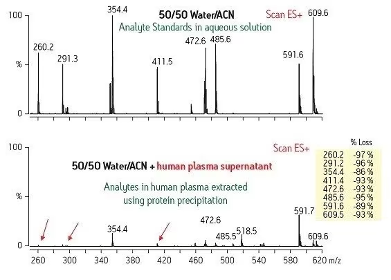 可以在圖6中看到這種效應(yīng)。上圖是注入用生理鹽水制備的目標(biāo)化合物溶液的信號(hào)。下方跡線顯示,當(dāng)分析人血漿中所含的這些相同化合物時(shí),信號(hào)響應(yīng)顯著下降[抑制率 > 90%]。對(duì)于下方跡線,僅執(zhí)行了常規(guī)蛋白沉淀步驟。該技術(shù)無(wú)法清除引起離子抑制的基質(zhì)干擾物,導(dǎo)致信號(hào)響應(yīng)不佳。