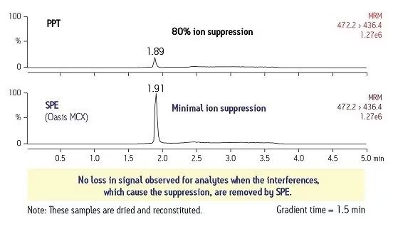 有時(shí),樣品基質(zhì)中的干擾物會(huì)人為增加化合物信號(hào)的報(bào)告值。這種現(xiàn)象稱為離子增強(qiáng)效應(yīng),會(huì)導(dǎo)致誤報(bào)偏高的信號(hào)值。適當(dāng)?shù)腟PE方法可以清除化合物中的干擾物,盡可能減弱該效應(yīng),從而得到更準(zhǔn)確的報(bào)告值。