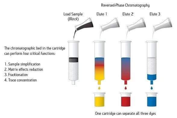 SPE是一項(xiàng)樣品前處理技術(shù),采用固體顆粒色譜填料(通常裝于小柱型裝置中)對(duì)樣品的不同組分進(jìn)行化學(xué)分離。樣品幾乎總是處于液態(tài)[盡管一些特殊應(yīng)用可能會(huì)使用一些氣相樣品]。圖1所示為使用SPE裝置處理一個(gè)黑色樣品,以便對(duì)組成該樣品的各染料化合物進(jìn)行色譜分離。