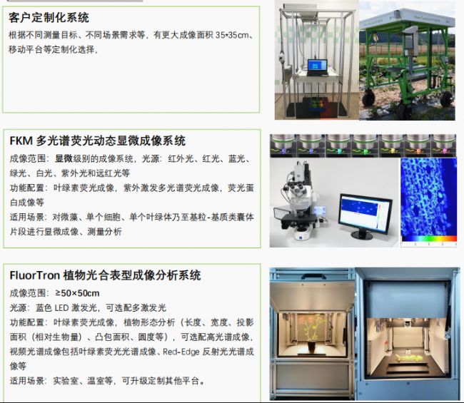 ATP合成和CO2固定等過程有關。是研究光合作用的探針。通過葉綠素熒光測量技術,可以快速、靈敏、準確地獲得眾多葉綠素熒光參數,這些參數反映植物、藻類等測量目標的光合效率。而葉綠素熒光成像則將葉綠素熒光測量代入二維成像時代。該技術已經大量應用于植物、藻類研究的各個領域,包括表型組學、遺傳育種、病蟲害、脅迫檢測、光合生理研究、基因功能鑒定、突變體篩選、園藝研究等。