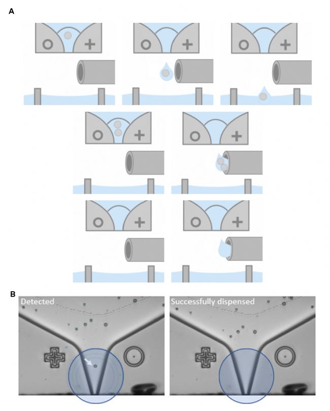 B.SIGHT專為快速、簡單、溫和地分離單菌株而設(shè)計(jì),能夠利用高分辨率成像技術(shù)進(jìn)行微生物細(xì)胞分離。在實(shí)驗(yàn)中,樣本首先加載到一個(gè)墨盒中,然后進(jìn)入一個(gè)直徑為20 µm的噴嘴。當(dāng)壓電傳感器驅(qū)動(dòng)的活塞推動(dòng)硅膜時(shí),分配芯片會迅速按需生成小液滴。在操作過程中,對分配芯片噴嘴區(qū)域連續(xù)成像。檢測軟件會自動(dòng)分析每個(gè)經(jīng)過的顆粒,確認(rèn)下一個(gè)液滴中是否包含符合參數(shù)的單個(gè)細(xì)胞,只有符合條件的細(xì)胞才會被分配到下方的96孔或384孔板的一個(gè)孔中。多余的液滴,如空液滴或包含多個(gè)細(xì)胞的液滴,在分配之前會被真空去除(圖2A)。每個(gè)被分配液滴在噴嘴區(qū)域采集的圖像都會自動(dòng)存儲,以便后續(xù)驗(yàn)證單細(xì)胞分離的準(zhǔn)確性(圖2B)。