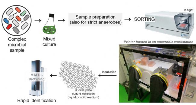 為了解決上述問題,我們在此介紹一種快速生成腸道細(xì)菌無菌培養(yǎng)物的簡化工作流程。繞過低效的有限稀釋步驟,我們采用專為快速分選單個(gè)微生物細(xì)胞并直接生成克隆培養(yǎng)物而設(shè)計(jì)的B.SIGHT系統(tǒng)。B.SIGHT可以將單個(gè)微生物細(xì)胞分離到液體培養(yǎng)基或固體瓊脂上。這種臺式的系統(tǒng)也可放置在厭氧工作站中,非常適合處理厭氧菌。