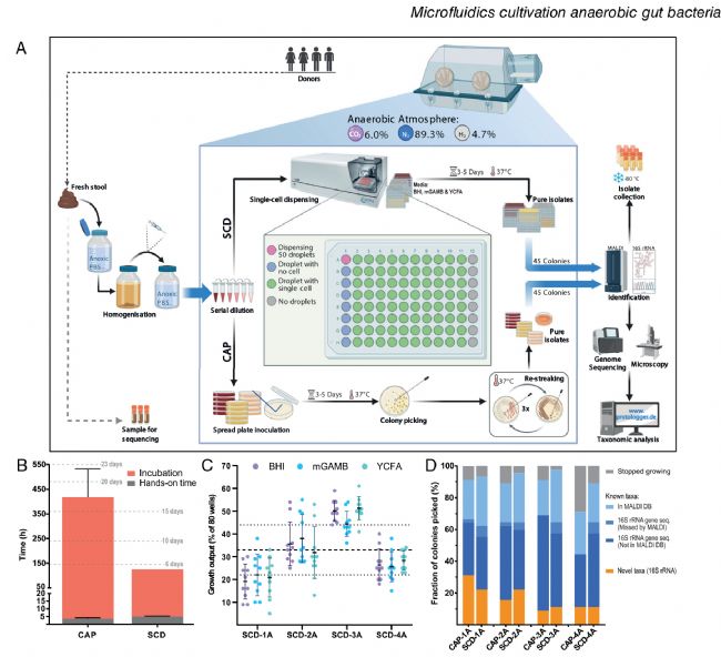 經(jīng)典的瓊脂平板(CAP)方法雖然廣泛用于研究微生物群落,但其耗時(shí)頗長。相比之下,單細(xì)胞分配(SCD)方法則允許高通量、無標(biāo)記地分選微生物。德國亞琛工業(yè)大學(xué)研究團(tuán)隊(duì)借助B.SIGHT系統(tǒng)開發(fā)了一種新的厭氧SCD方案,用于培養(yǎng)人類腸道細(xì)菌,并通過糞便樣本在三種富營養(yǎng)培養(yǎng)基上,與CAP方法進(jìn)行了對比。實(shí)驗(yàn)結(jié)果顯示,新的厭氧SCD方法將單克隆培養(yǎng)物的獲得時(shí)間從17天縮短至5天,同時(shí)其分離細(xì)菌的多樣性和相對豐度在覆蓋率與CAP方法相當(dāng)。