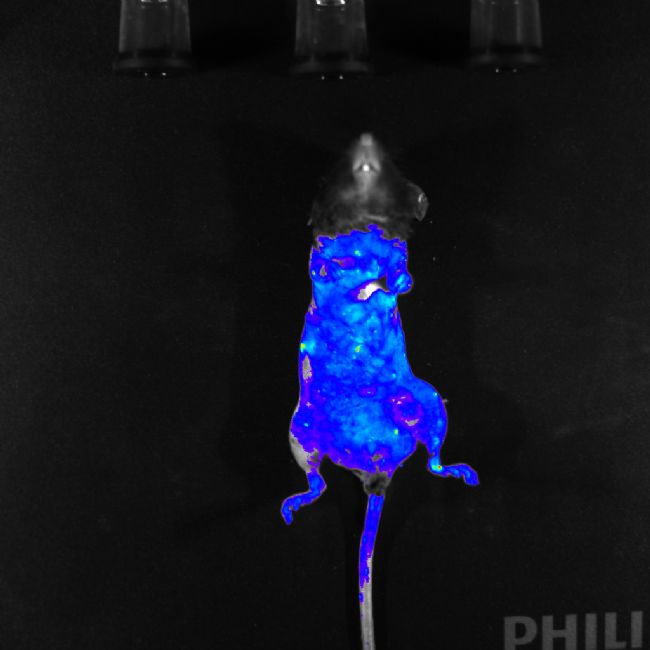 在一定范圍內(nèi),發(fā)光強度與被標(biāo)記的細(xì)胞數(shù)量正相關(guān),通過對發(fā)光信號的定量,可以反應(yīng)腫瘤組織的變化情況;铙w成像系統(tǒng)依靠高靈敏度的相機,可以捕捉這種微弱的生物發(fā)光信號。因為哺乳動物體內(nèi)不會有熒光素酶報告基因的存在,因此這種檢測方法的優(yōu)勢是特異性好,無背景信號干擾。缺陷是應(yīng)用范圍較窄,只能夠用于標(biāo)記細(xì)胞。
