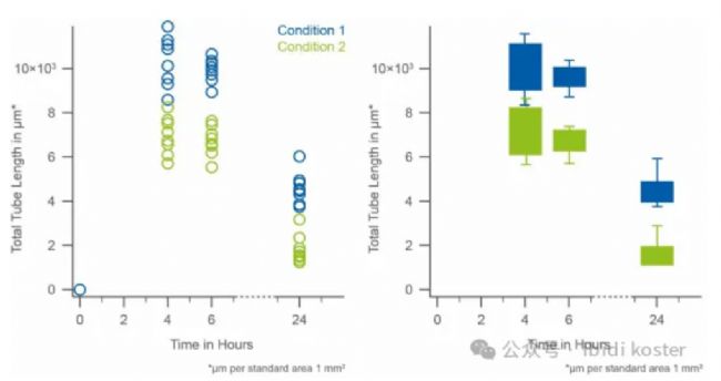 在 Matrigel 基質(zhì)膠上,兩種不同條件(條件 1 與條件 2)下培養(yǎng)的 HUVEC 細(xì)胞的總管長(zhǎng)變化,以散點(diǎn)圖(左)以及箱線圖(右)兩種形式呈現(xiàn)。