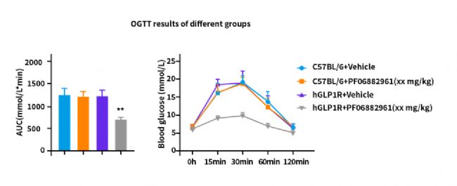 Fig2. Efficacy study of PF06882961 in hGLP1R mice. PF06882961 has shown significant effect in hGLP1R mice in OGTT study, but no effect in C57BL/6 mice.