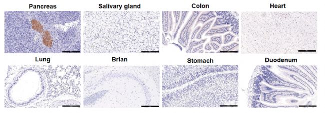 Fig4. Detection of human GLP-1R expression in HO hGLP-1R knockin mice by IHC. Pancreas, salivary gland, colon, heart, lung, brian, stomach and duodenum were collected from homozygous hGLP-1R mice (HO/HO), and analyzed by IHC with anti-human GLP-1R antibody. Human GLP-1R is specifically expressed in islets of the pancreas. Abbr. HO/HO, homozygous.