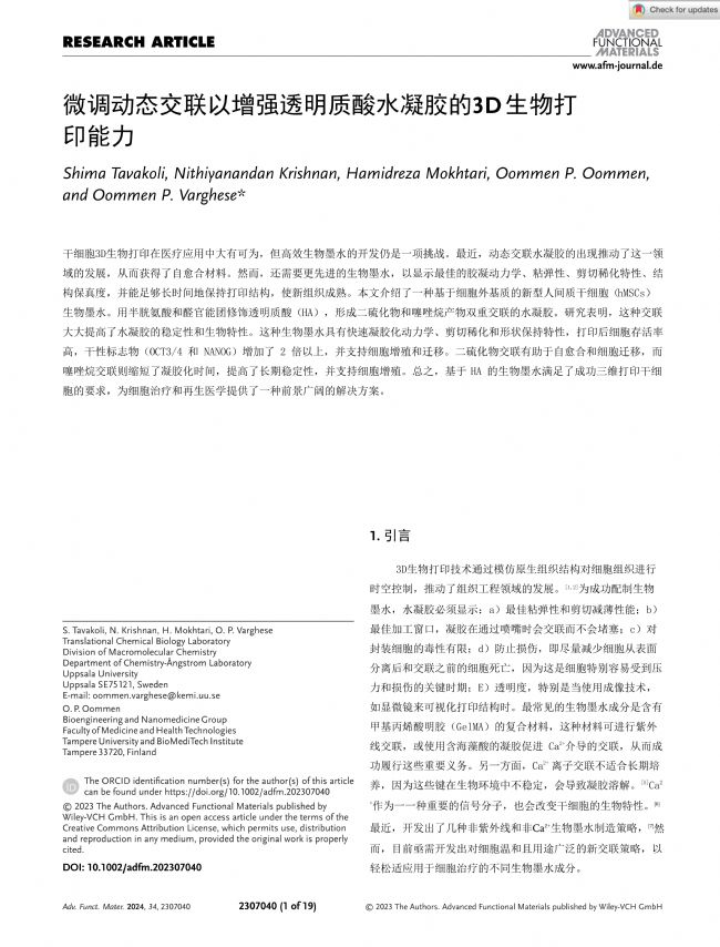 > 文獻(xiàn)解讀:微調(diào)動(dòng)態(tài)交聯(lián)以增強(qiáng)透明質(zhì)酸水凝膠的3D生物打印能力
