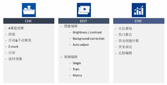 圖3 JuLI™ Stage配備的3個(gè)軟件及對(duì)應(yīng)軟件下的具體功能(拍攝/編輯/分析軟件)